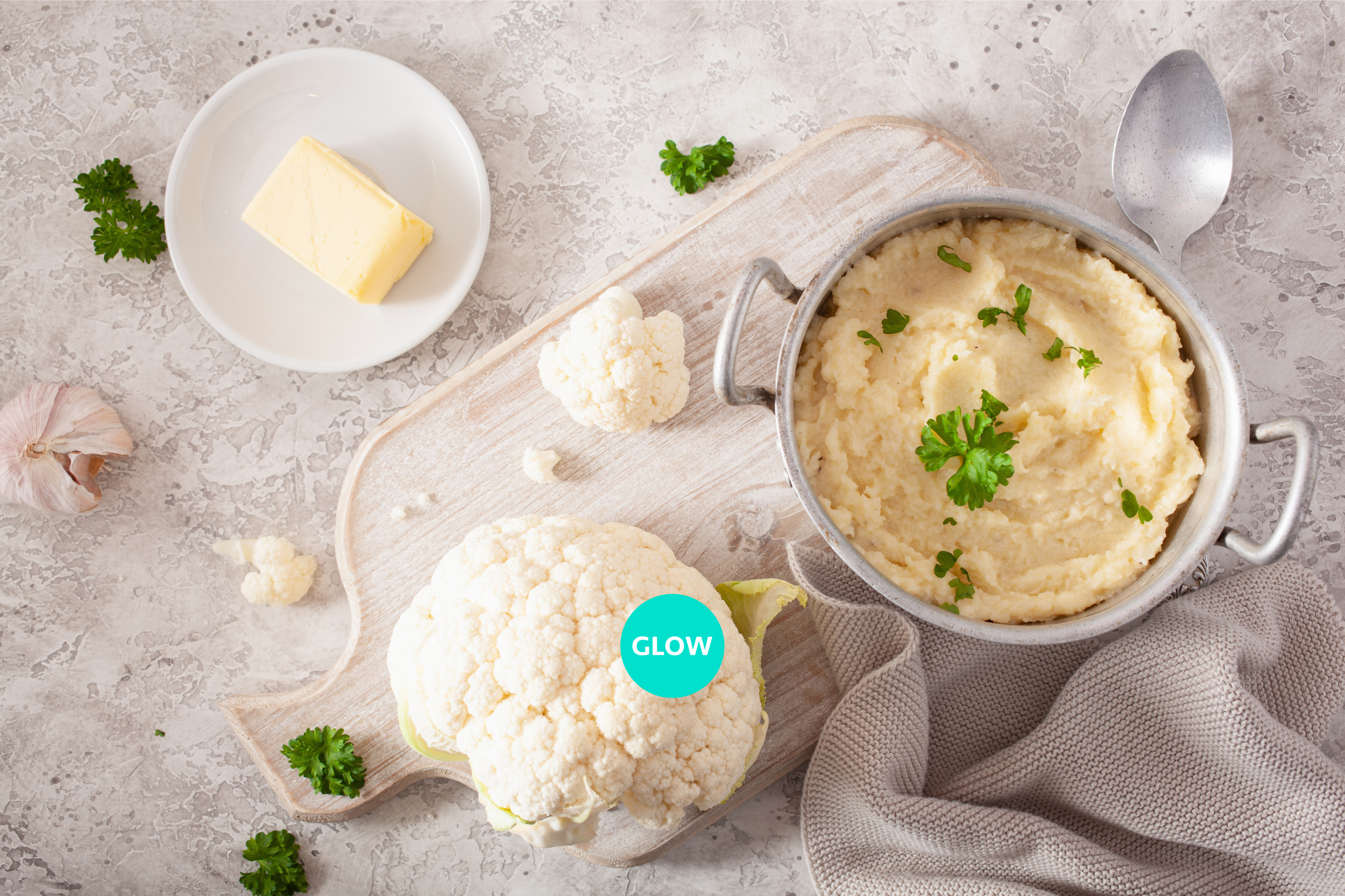 Head of cauliflower, remove stems if you have digestive symptoms like bloating