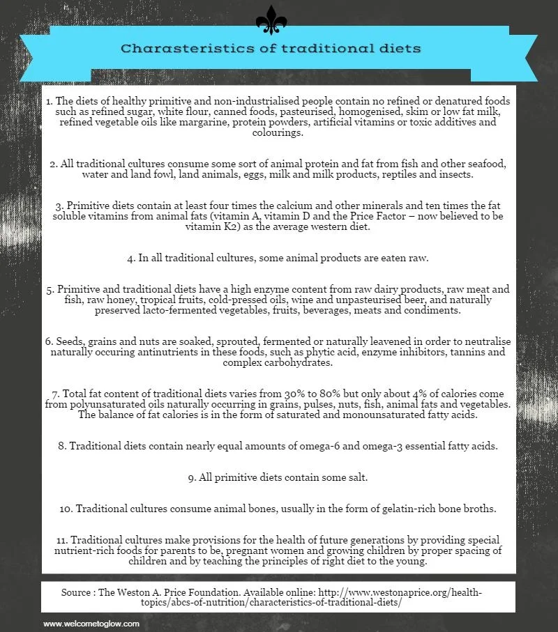 There is no such thing as a specific traditional diet. However, there are some common characteristics of all ancestral diets across the globe that can be adopted in the modern world, in any location, depending on what's available to you locally, and what your grandparents ate: